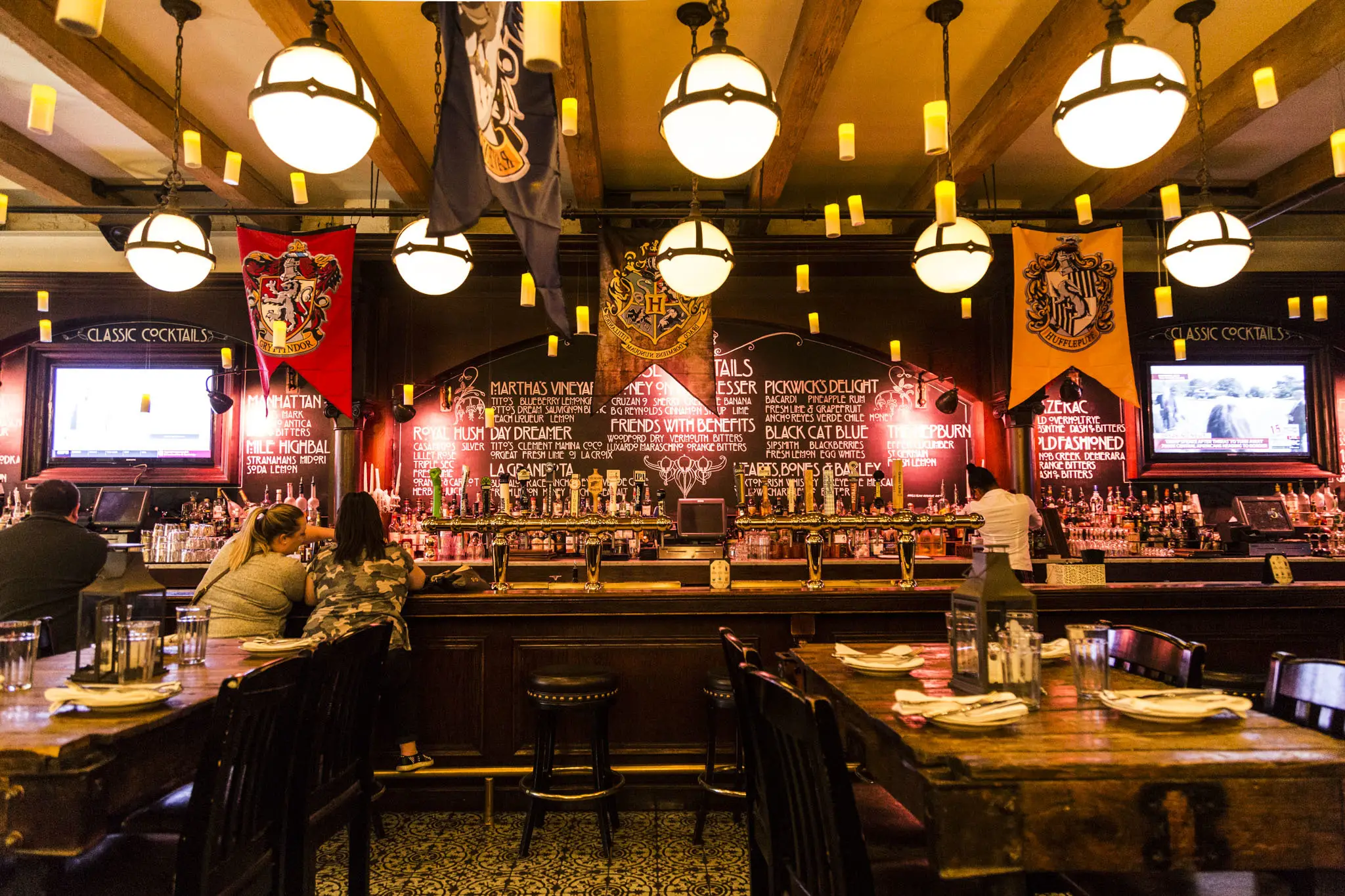 Duvarlarda Hogwarts vari taş işçilik, loş atmosfer, mum ışığı… Menüde İngiliz usulü rostolar, balkabağı tatlıları, “Wizard’s Brew” isimli özel içecekler var.